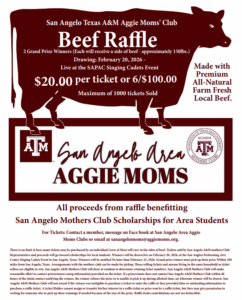 Each year in conjunction with one of our fundraising events, San Angelo A&M Mother’s Club sells Raffle Tickets that are limited in sales to 1,000 tickets. This year, we are doing it in conjunction with the A&M Singing Cadets Performance.  There will be a drawing held live at the performance on February 20, 2026 and each ticket has the chance to win one (1) of two (2) Sides of Beef (approx. 150 lbs). This is Premium, All-Natural Farm Fresh Local Beef!!  Tickets are $20.00 each or six (6) for $100.00.  To get yours, contact any Aggie Mom or pay through PayPal or Venmo and your purchased ticket(s) can be texted or emailed to you.